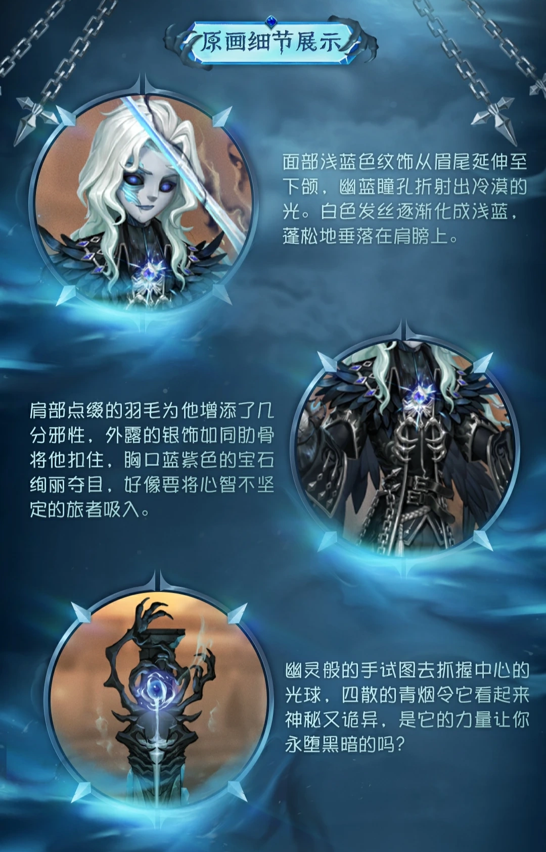 The Photographer - Necromancer has white hair, and the tail of the hair gradually turns blue, which echoes the blue tattoo extending from the end of the eyebrow to the lower jaw. His blue pupils stared indifferently at the prey in front of him. The shoulders of the Photographer - Necromancer are dotted with black feathers, and his sleeves have turned into wings, making him look mysterious. The blue-purple gemstones on the chest are very dazzling, but there are withered decorations underneath, and the great contrast brings visual impact. Beside the Photographer - Necromancer, a blue pupil is guarded by the withered hand of the undead, and there is a strange atmosphere under the shroud of green smoke.