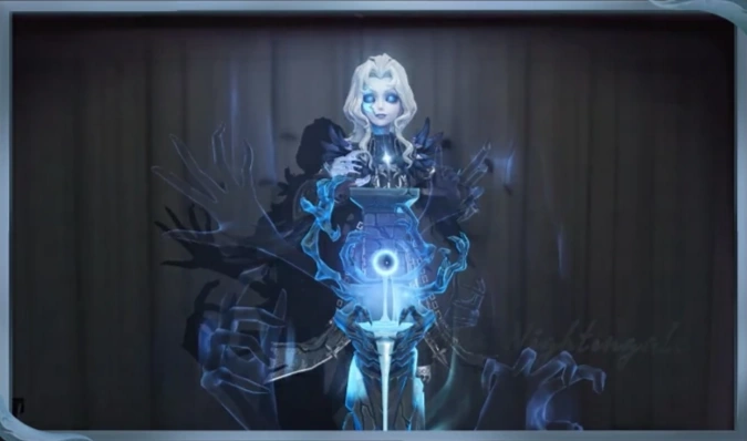 Camera burns with pale blue flames, while in use skeleton hands move around hourglass in a move resembling crystal ball divination.
