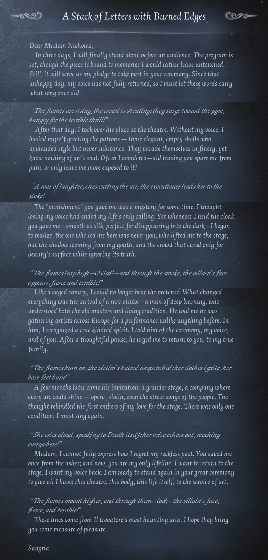 In three days, I will finally stand alone before an audience. The program is set, though the piece is bound to memories I would rather leave untouched. Still, it will serve as my pledge to take part in your ceremony. Since that unhappy day, my voice has not fully returned, so I must let these words carry what song once did.