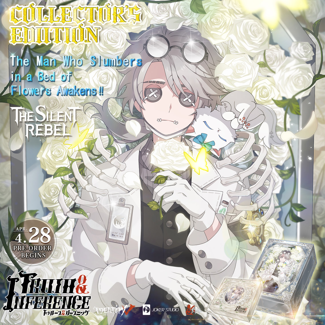 The Silent Rebel was a real-life package sold for $129 (Premium Edition) or $489 (Collector's Edition) from April 28th[1] to July 4th, 2023. The packages first began to ship on December 8th, 2023. It was sold for Identity V's Fifth Anniversary and themed around the Truth & Inference cast, focusing on the newest addition, "Gatto".