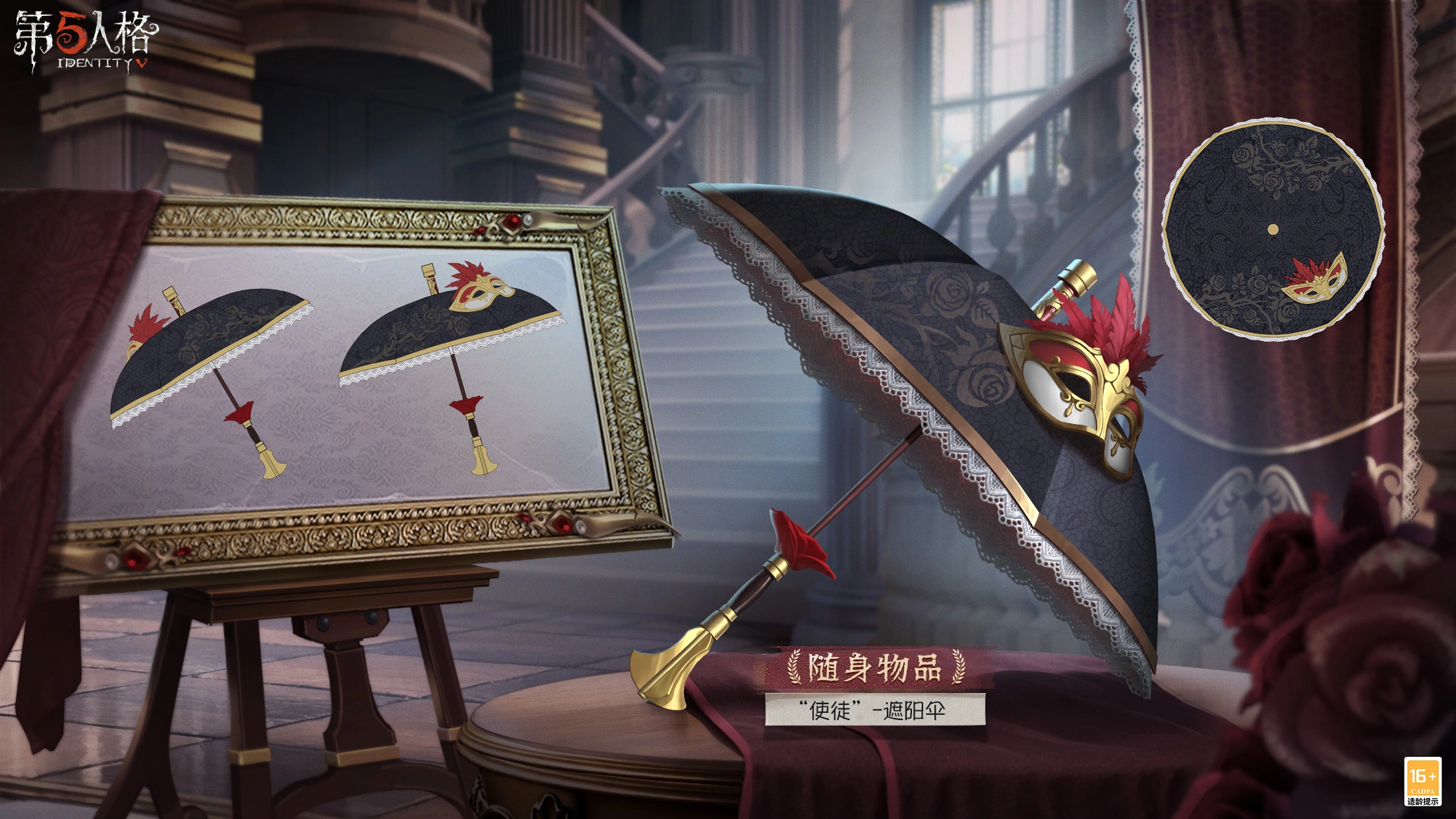 As in the name, it appears as a tiny parasol, with a dark brown handle. At the bottom of the handle, a four-sided golden decoration is placed, with a bell-like shape. The top of the handle has a golden ring, with a rose above it, from which the rest of the parasol's light brown shaft extends from. The parasol's canopy is made out of light black fabric, with a black floral pattern featuring vines, leaves and roses. on two sides of the canopy, the pattern is colored gold instead. On one of those side's, a mask with a golden rim and nose, red feathers on top, and red and white around the eyes and mouth respectively, lies near the top. The canopy has gold edges, and on the undersides a white fabric with a pattern, with a triangular cut pattern as well. The end tip of the Parasol is now golden, with a red ring around it, and a golden knob at the top.