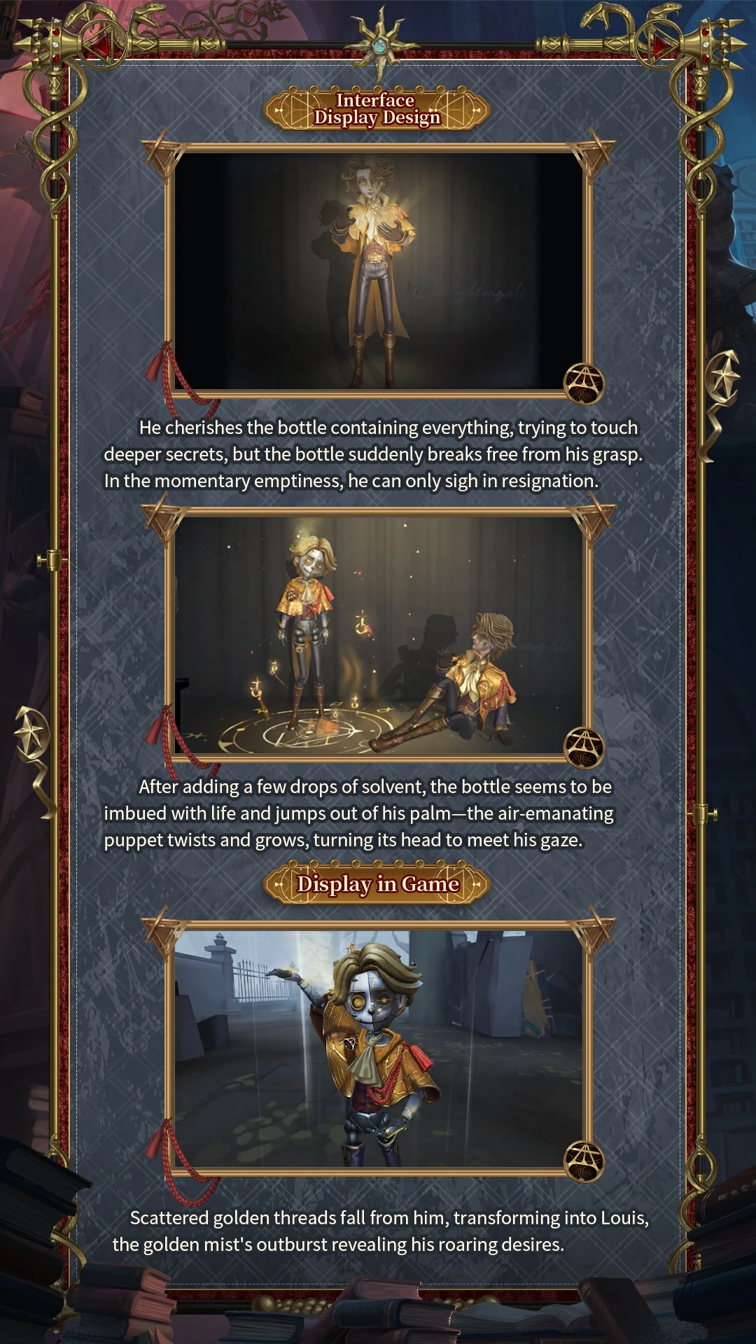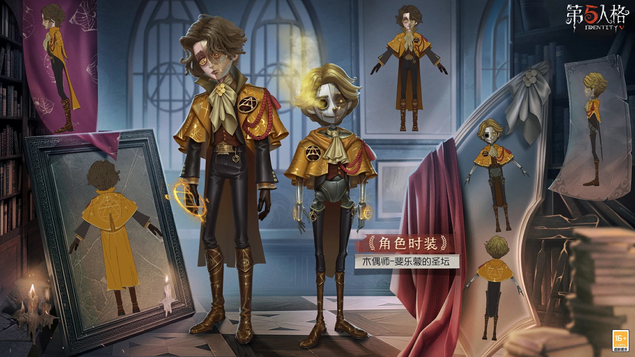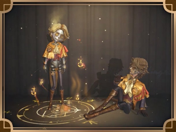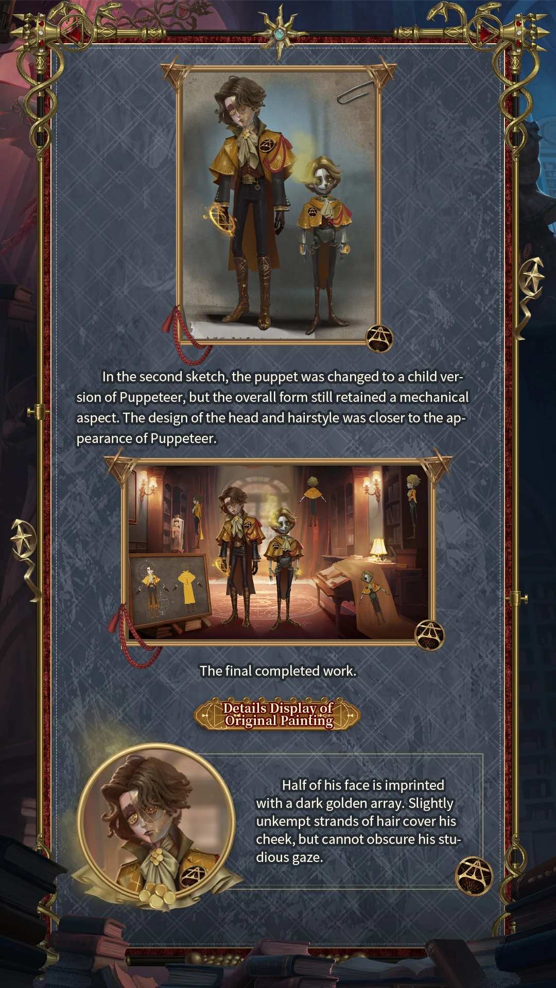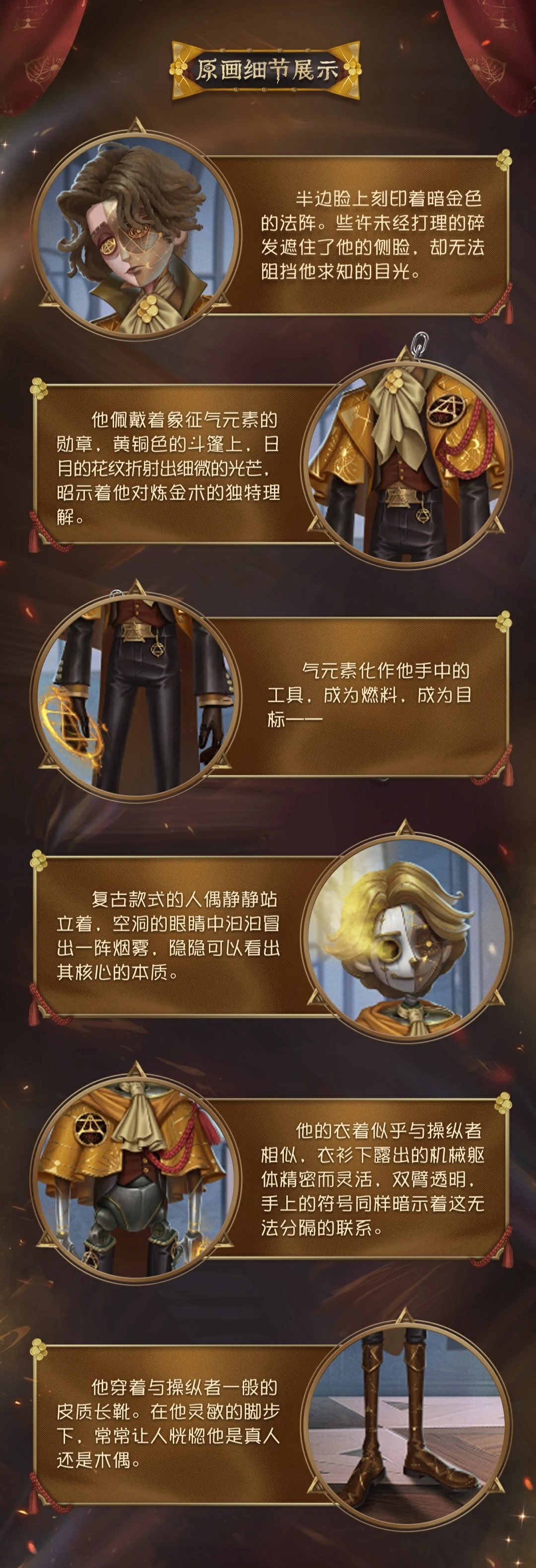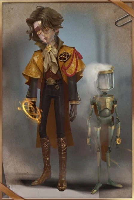 [A Costume] Puppeteer - Philemon's Altar has a dark golden magic circle engraved on half of his face. Some unkempt hair covers his side face, but it can't block his eyes of seeking knowledge. He wears a medal symbolizing the element of air. On his brass cloak, the pattern of the sun and the moon reflects a subtle light, showing his unique understanding of alchemy. The element of air becomes a tool in his hand, a fuel, and a goal.