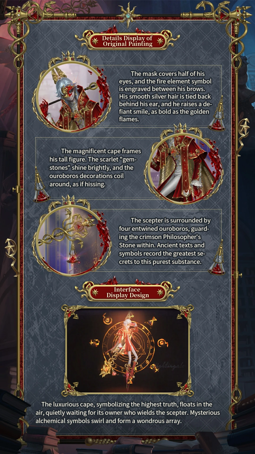 This essence revolves around the theme of alchemy. The characters in the essence all have their own understanding of alchemy, and therefore choose different paths. The overall costume is based on the interpretation of mysticism and is decorated with a large number of alchemical symbols, ores, and magic circles, which constitute the essence of this essence's visual features.