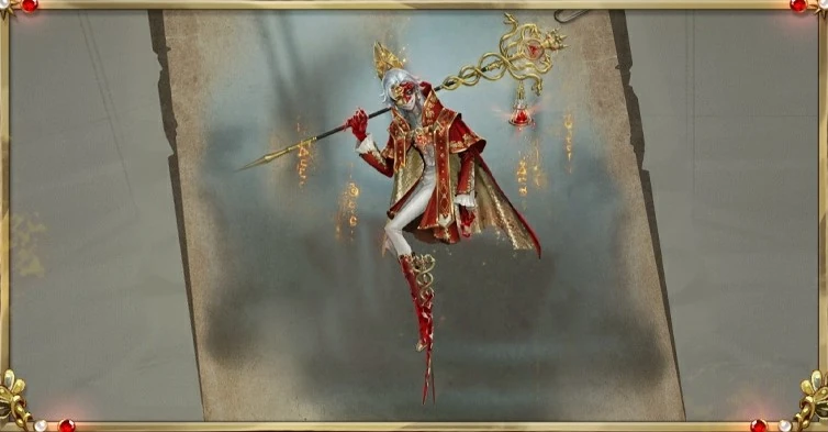 He wears a crimson brocade cloak with a high collar and golden embellishments, with a crimson scarf with golden hems and diamond patterns running down it draped over the brocade. One side of it seems to be crumbling away. The inside of the brocade is a scaly gold, and a golden ouroboros symbol can be seen on the back. A golden piece with intricate designs and a triangular ruby across his chest hold the two sides of the brocade together.