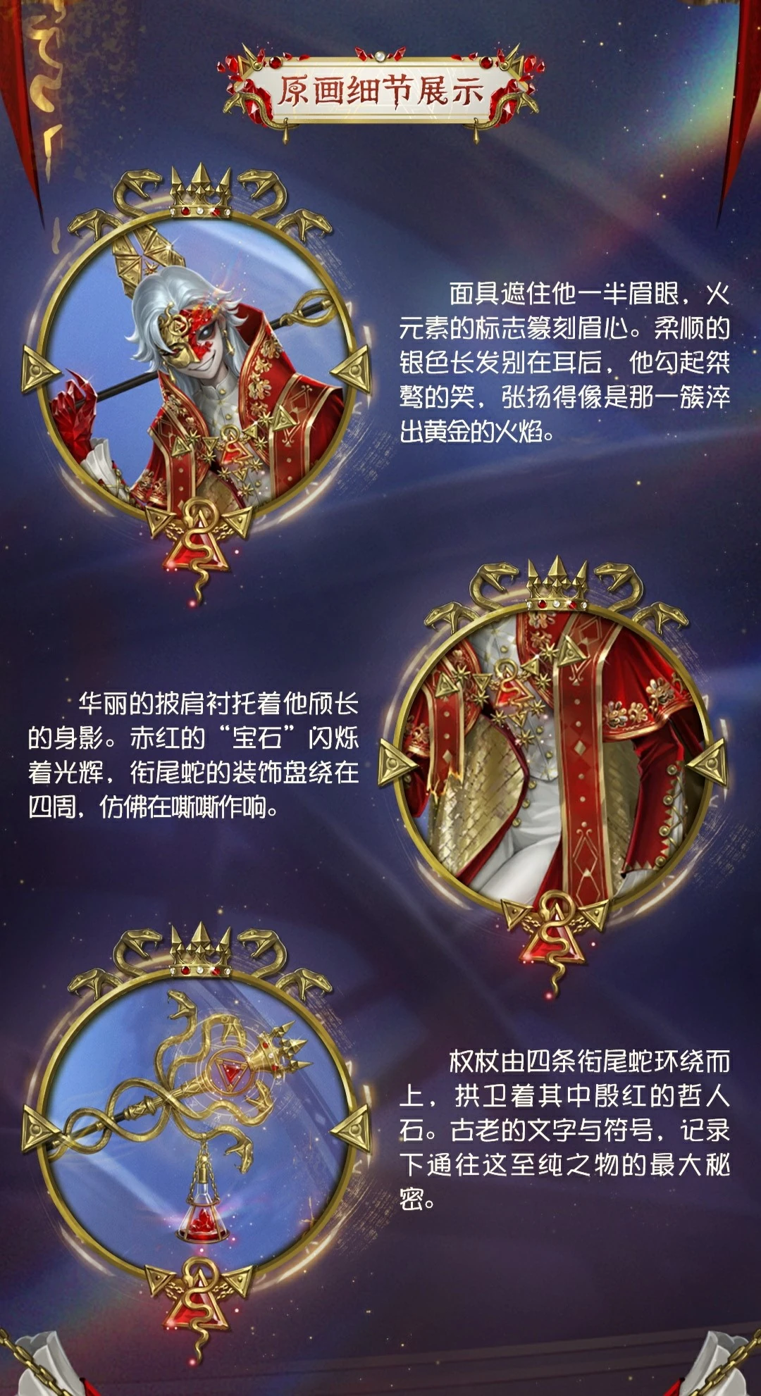 [S Costume] Night Watch - Philosopher's Stone's mask covers half of his eyes and eyebrows, and the symbol of the fire element is engraved between his eyebrows. His long, smooth silver hair is tucked behind his ears. He smiles unruly, as flamboyant as a cluster of flames quenched from gold. The gorgeous shawl sets off his tall figure.