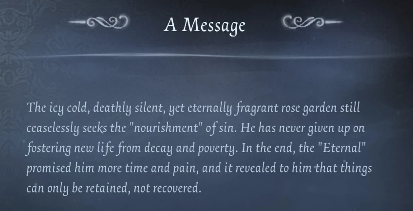 The icy cold, deathly silent, yet eternally fragrant rose garden still ceaselessly seeks the "nourishment" of sin. He has never given up on fostering new life from decay and poverty. In the end, the "Eternal" promised him more time and pain, and it revealed to him that things can only be retained, not recovered.