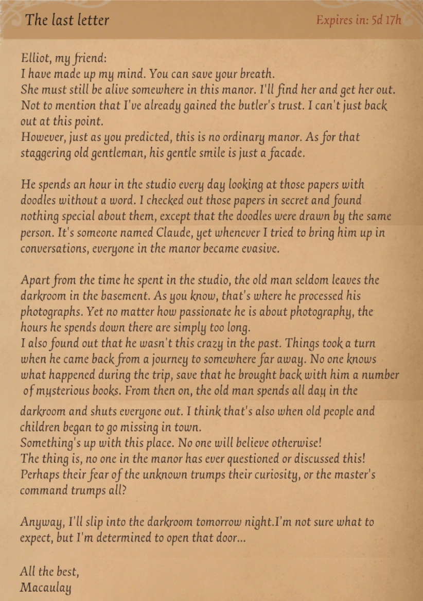 He spends an hour in the studio every day looking at those papers with doodles without a word. I checked out those papers in secret and found nothing special about them, except that the doodles were drawn by the same person. It's someone called Claude, yet whenever I tried to bring him up in conversations, everyone in the manor became evasive.