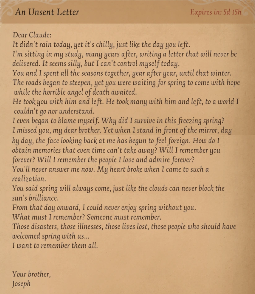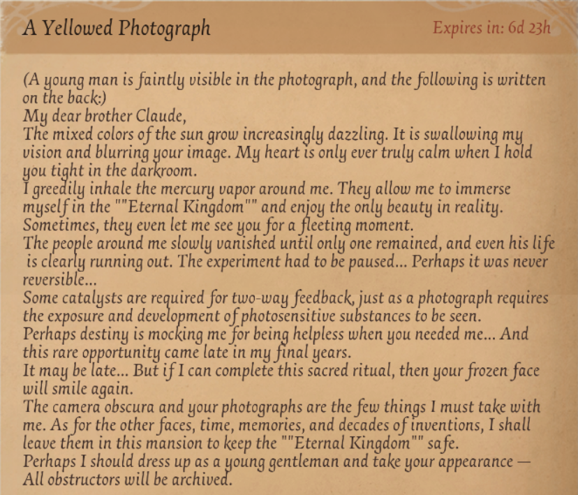 This section contains the letters received after completing all quests part of the Photographer's Character Day event on March 11th each year. After the event they can be accessed in the file section of the character's Notebook page.