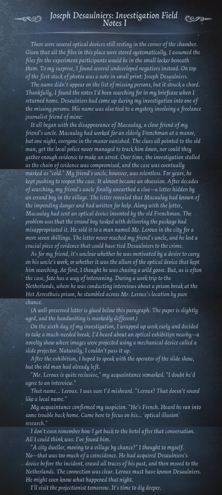 It all began with the disappearance of Macaulay, a close friend of my friend's uncle. Macaulay had worked for an elderly Frenchman at a manor, but one night, everyone in the manor vanished. The clues all pointed to the old man, yet the local police never managed to track him down, nor could they gather enough evidence to make an arrest. Over time, the investigation stalled as the chain of evidence was compromised, and the case was eventually marked as "cold." My friend's uncle, however, was relentless. For years, he kept pushing to reopen the case. It almost became an obsession. After decades of searching, my friend's uncle finally unearthed a clue-a letter hidden by an errand boy in the village. The letter revealed that Macaulay had known of the impending danger and had written for help. Along with the letter, Macaulay had sent an optical device invented by the old Frenchman. The problem was that the errand boy tasked with delivering the package had misappropriated it. He sold it to a man named Mr. Leroux in the city for a mere seven shillings. The letter never reached my friend's uncle, and he lost a crucial piece of evidence that could have tied Desaulniers to the crime.