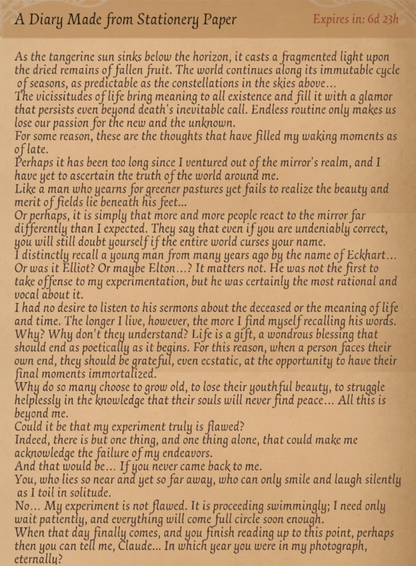 The camera obscura and your photographs are the few things I must take with me. As for the other faces, time, memories, and decades of inventions, I shall leave them in this mansion to keep the "Eternal Kingdom" safe.