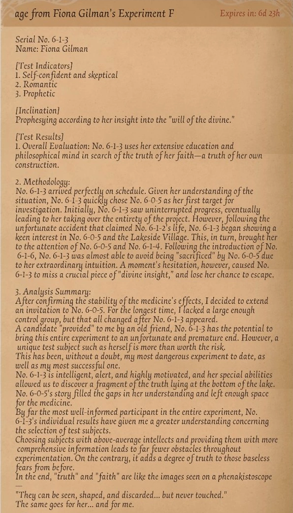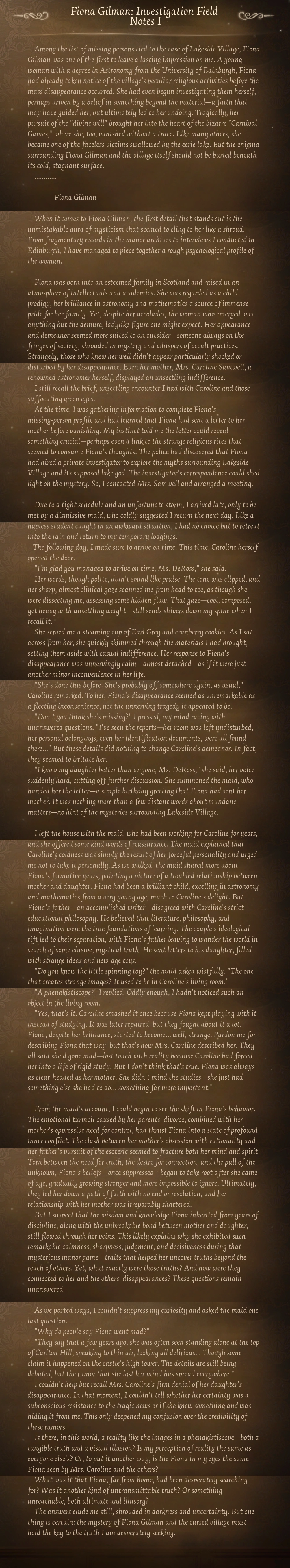 Among the list of missing persons tied to the case of Lakeside Village, Fiona Gilman was one of the first to leave a lasting impression on me. A young woman with a degree in Astronomy from the University of Edinburgh, Fiona had already taken notice of the village's peculiar religious activities before the mass disappearance occurred. She had even begun investigating them herself, perhaps driven by a belief in something beyond the material—a faith that may have guided her, but ultimately led to her undoing. Tragically, her pursuit of the "divine will" brought her into the heart of the bizarre "Carnival Games," where she, too, vanished without a trace. Like many others, she became one of the faceless victims swallowed by the eerie lake. But the enigma surrounding Fiona Gilman and the village itself should not be buried beneath its cold, stagnant surface.