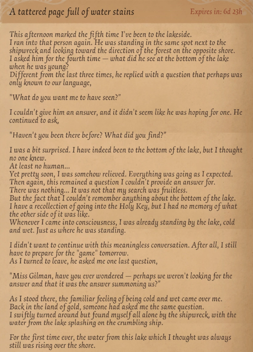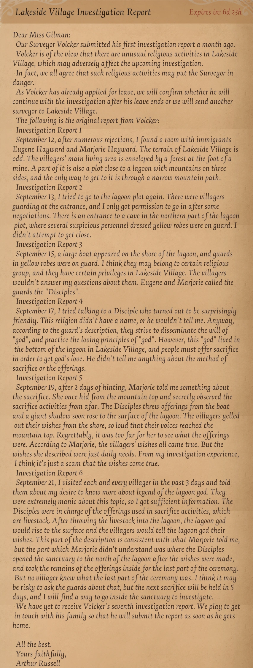 September 21, I visited each and every villager in the past 3 days and told them about my desire to know more about the legend of the lagoon god. They were extremely manic about this topic, so I got sufficient information. The Disciples were in charge of the offerings used in sacrifice activities, which are livestock. After throwing the livestock into the lagoon, the lagoon god would rise to the surface and the villagers would tell the lagoon god their wishes. This part of the description is consistent with what Marjorie told me, but the part which Marjorie didn’t understand was where the Disciples opened the sanctuary to the north of the lagoon after the wishes were made, and took the remains of the offerings inside for the last part of the ceremony. But no villager knew what the last part of the ceremony was. I think it may be risky to ask the guards about that, but the next sacrifice will be held in 5 days, and I will find a way to go inside the sanctuary to investigate.