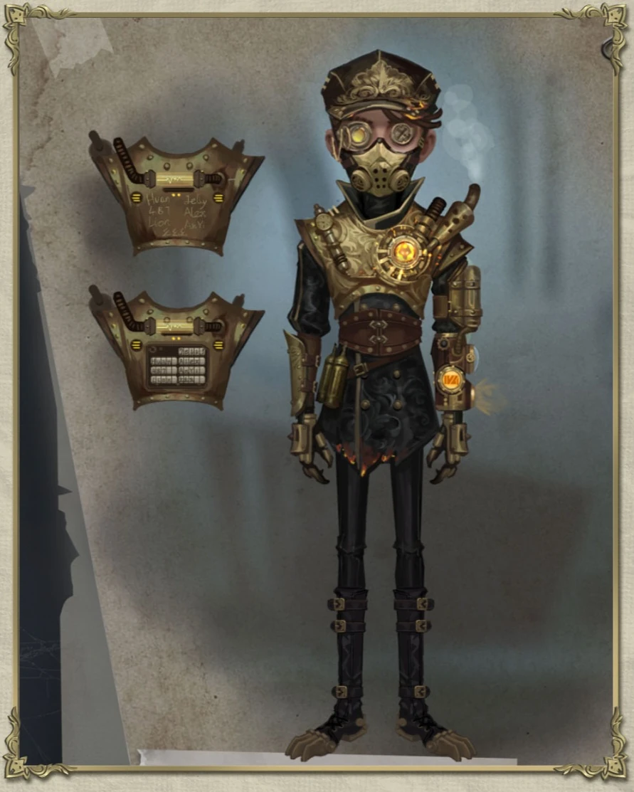 Naib wears a black cap with golden details. On his right eye is a golden monocle. He has a a bronze chest plate with a circle containing the symbol of team WOLVES on the front left. On the back of the chest plate is a series of scrolls with the names of the members of WOLVES. Under this is a black embroidered long-sleeved turtle neck that is burnt at the bottom. Around his waist are several brown belts, one of these securing two bronze canisters. He wears black pants extending into clawed boots, on his hands are black gloves and he has bronze claws on his fingers.
