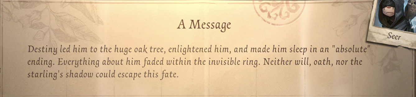 Destiny led him to the huge oak tree, enlightened him, and made him sleep in an "absolute" ending. Everything about him faded within the invisible ring. Neither will, oath, nor the starling's shadow could escape this fate.