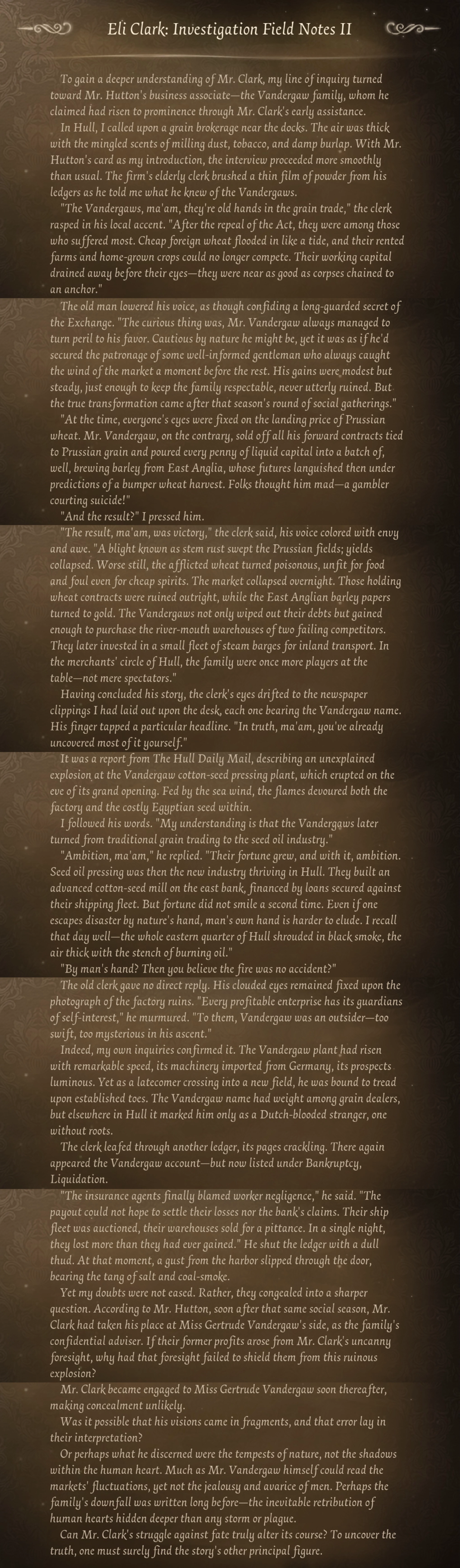 As the people of Silverdale struggled to survive after the repeal of the Grain Act, few noticed that Eli Clark had quietly integrated himself into the circle of the nouveau riche. According to Mr. Hutton, Mr. Clark was a man of few words but possessed great insight. It was with Mr. Clark's assistance that Mr. Hutton entered the coal trade and achieved his current success.
