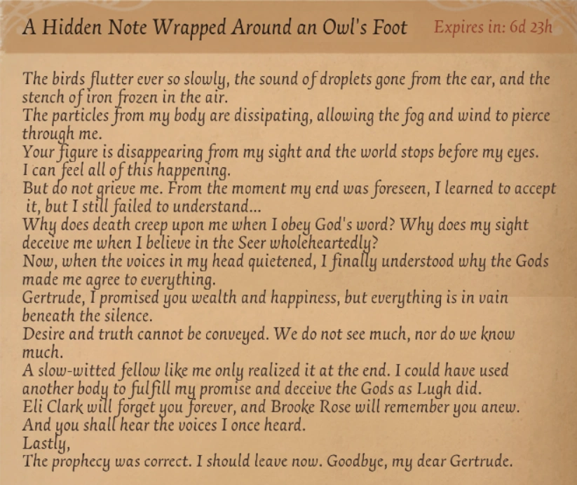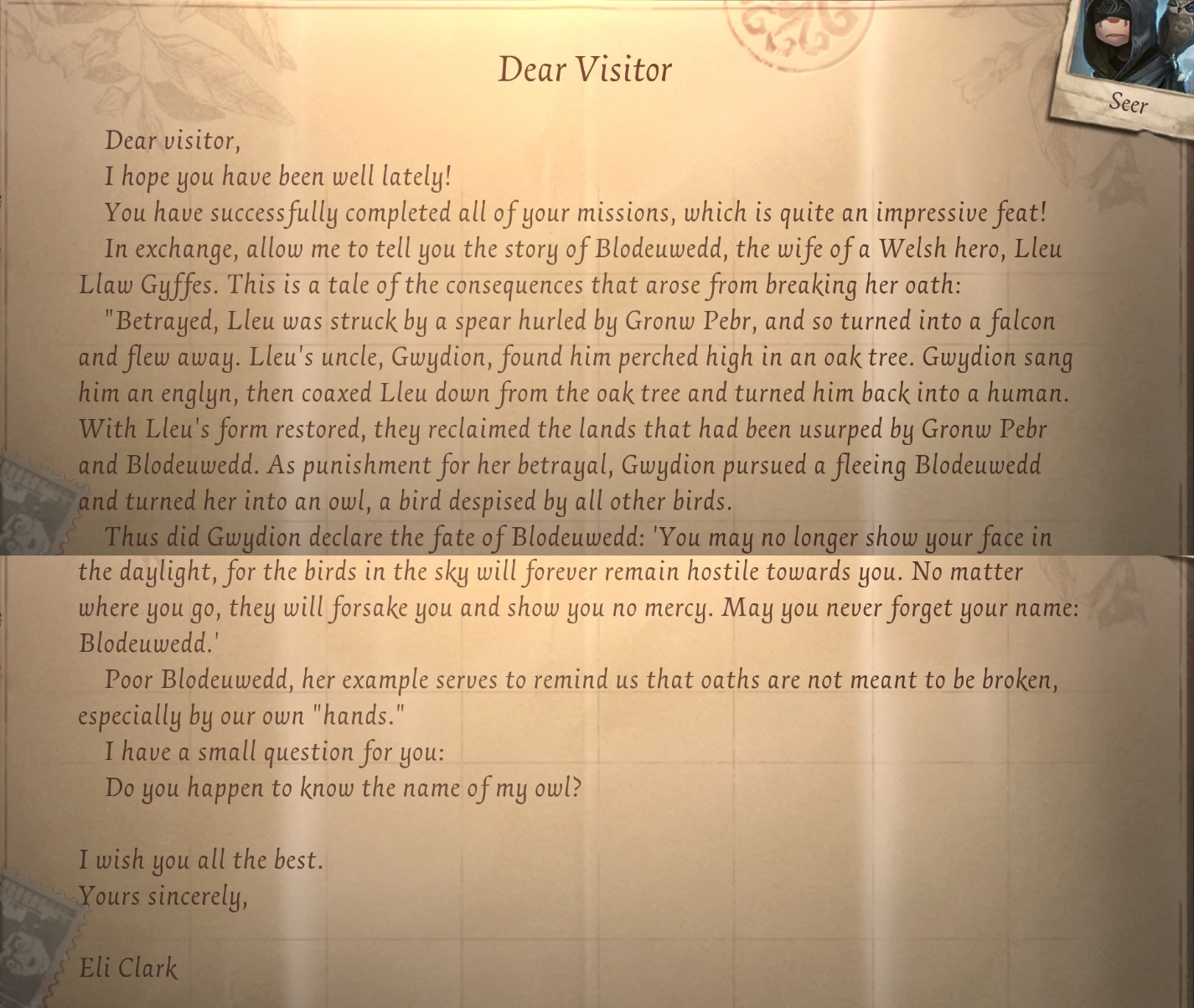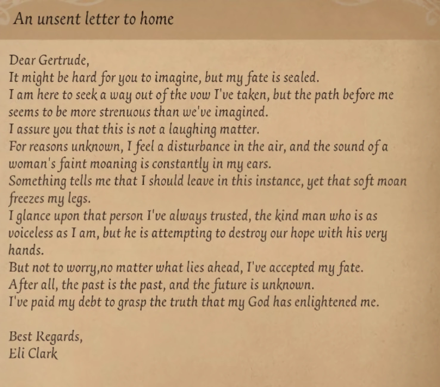This section contains the letters the player receives after completing Eli's Birthday Event on October 31st each year. After the event they can be accessed in the file section of the character's Notebook page.