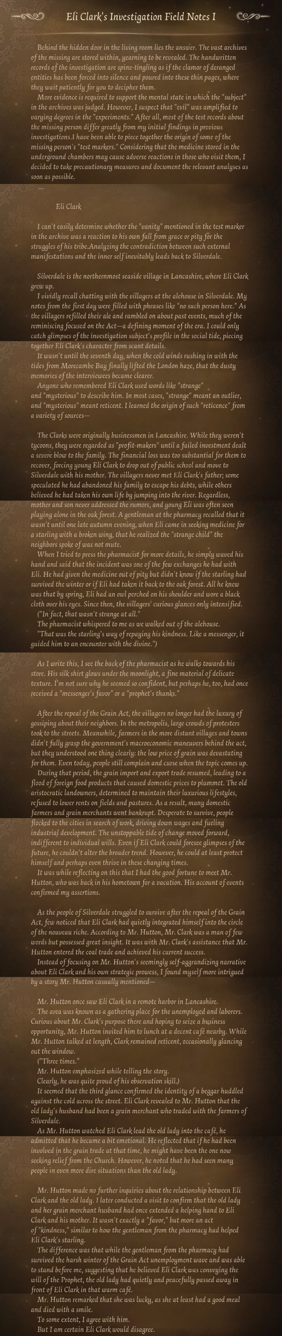 The Clarks were originally businessmen in Lancashire. While they weren't tycoons, they were regarded as "profit-makers" until a failed investment dealt a severe blow to the family. The financial loss was too substantial for them to recover, forcing young Eli Clark to drop out of public school and move to Silverdale with his mother. The villagers never met Eli Clark's father; some speculated he had abandoned his family to escape his debts, while others believed he had taken his own life by jumping into the river. Regardless, mother and son never addressed the rumors, and young Eli was often seen playing alone in the oak forest. A gentleman at the pharmacy recalled that it wasn't until one late autumn evening, when Eli came in seeking medicine for a starling with a broken wing, that he realized the "strange child" the neighbors spoke of was not mute.