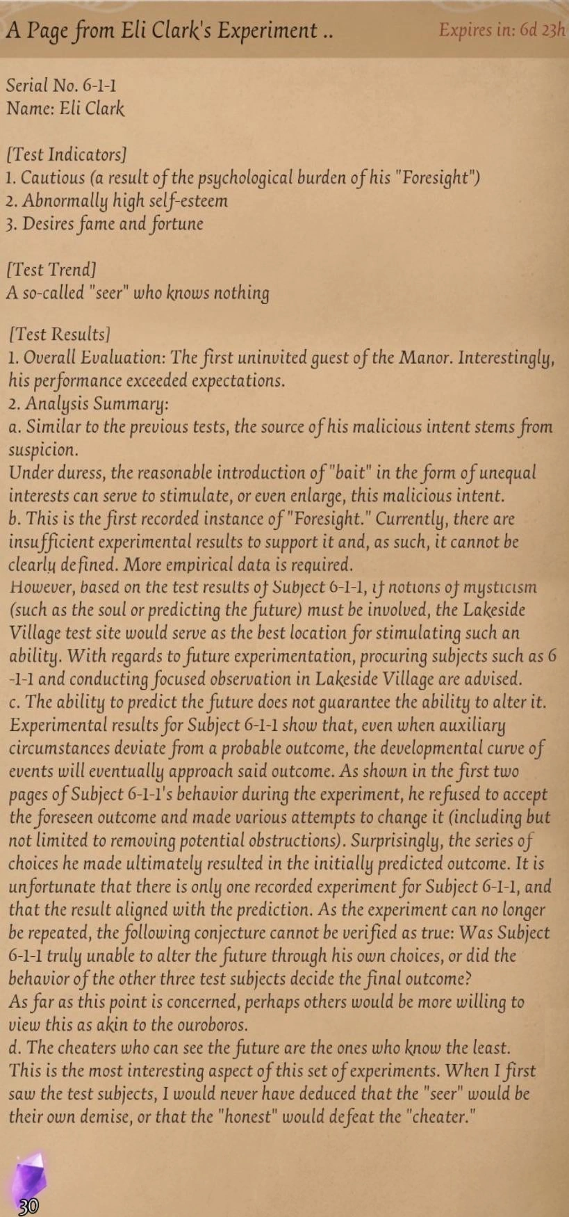 However, based on the test results of Subject 6-1-1, if notions of mysticism (such as the soul of predicting the future) must be involved, the Lakeside Village test site would serve as the best location for stimulating such an ability. With regards to future experimentation, procuring subjects such as 6-1-1 and conducting focused observation in Lakeside Village are advised.