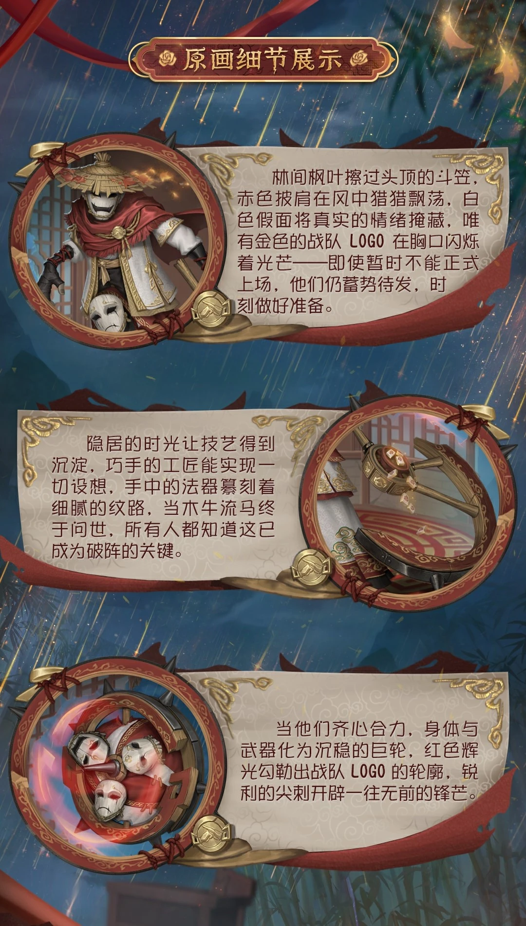 [A Costume] The Breaking Wheel - Siegeforged, maple leaves in the forest brush past the bamboo hat on the head, red shawl fluttering in the wind, white masks hiding the true emotions, only the golden team logo flashing on the chest - they are still ready to go, ready at any time. The time of seclusion has allowed the skills to be precipitated, and the skilled craftsmen can realize all their ideas. The magic tools in their hands are engraved with delicate patterns. When the wooden ox and flowing horse finally came out, everyone knew that this had become the key to breaking the formation. When they worked together, their bodies and weapons turned into a steady giant wheel, the red glow outlined the outline of the team logo, and the sharp spikes opened up an unstoppable edge.