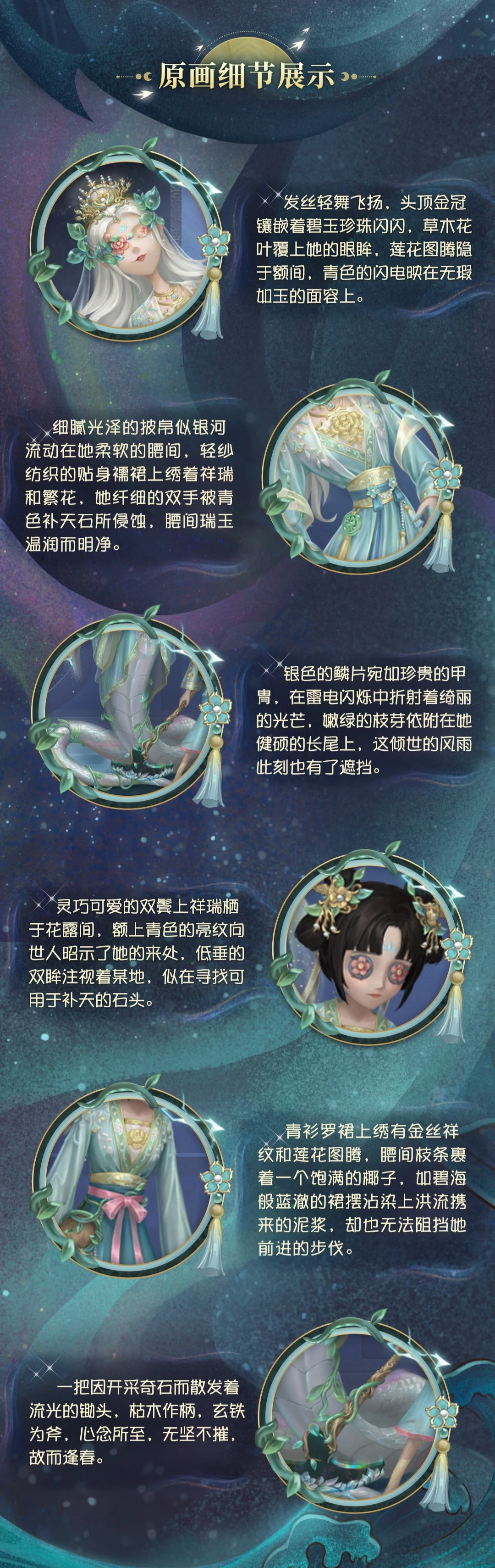 [A Costume] Dream Witch - Sky Mender, the Dream Witch and her follower are mainly in the blue color of the DOU5 team. They wear a golden crown to symbolize glory, and their long white hair is scattered like clouds, with cyan lightning patterns. Reflecting her face, the gorgeous underskirt is embroidered with gold threads and auspicious clouds, and is decorated with jade and white beads. The slender hands have traces of being eroded by the Sky-Mending Stone. Even if there are difficulties, they must move forward bravely. The silver scales on the lower body are hidden with cyan electric light. The follower next to her wears flower ornaments on her head, a light fan belt and a light dress. A plump coconut is wrapped around the branch of the waist. The skirt is as blue as the blue sea and is stained by the torrent. The mud that came came could not stop her progress. A hoe that shines brightly due to the mining of strange stones is wrapped with ivy. It is precisely because of careful cultivation that the dead wood can grow into spring.