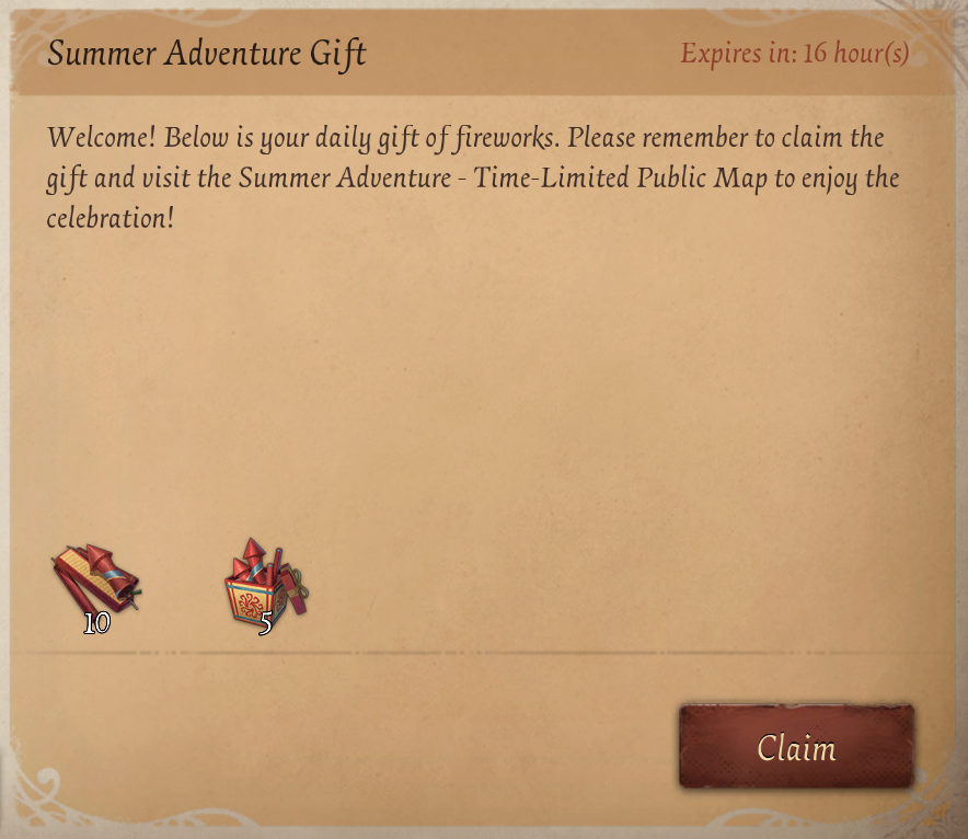 Welcome! Below is your daily gift of fireworks. Please remember to claim the gift and visit the Summer Adventure - Time-Limited Public Map to enjoy the celebration!