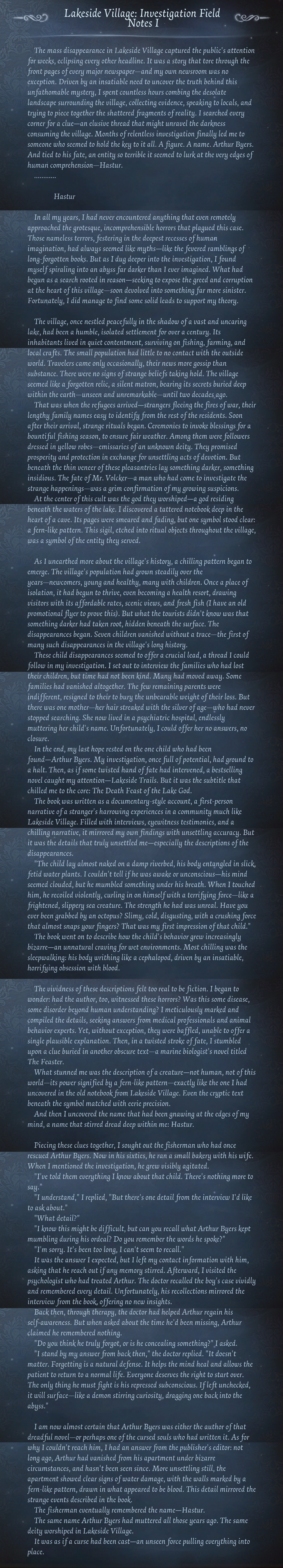 The mass disappearance in Lakeside Village captured the public's attention for weeks, eclipsing every other headline. It was a story that tore through the front pages of every major newspaper—and my own newsroom was no exception. Driven by an insatiable need to uncover the truth behind this unfathomable mystery, I spent countless hours combing the desolate landscape surrounding the village, collecting evidence, speaking to locals, and trying to piece together the shattered fragments of reality. I searched every corner for a clue—an elusive thread that might unravel the darkness consuming the village. Months of relentless investigation finally led me to someone who seemed to hold the key to it all. A figure. A name. Arthur Byers. And tied to his fate, an entity so terrible it seemed to lurk at the very edges of human comprehension—Hastur.