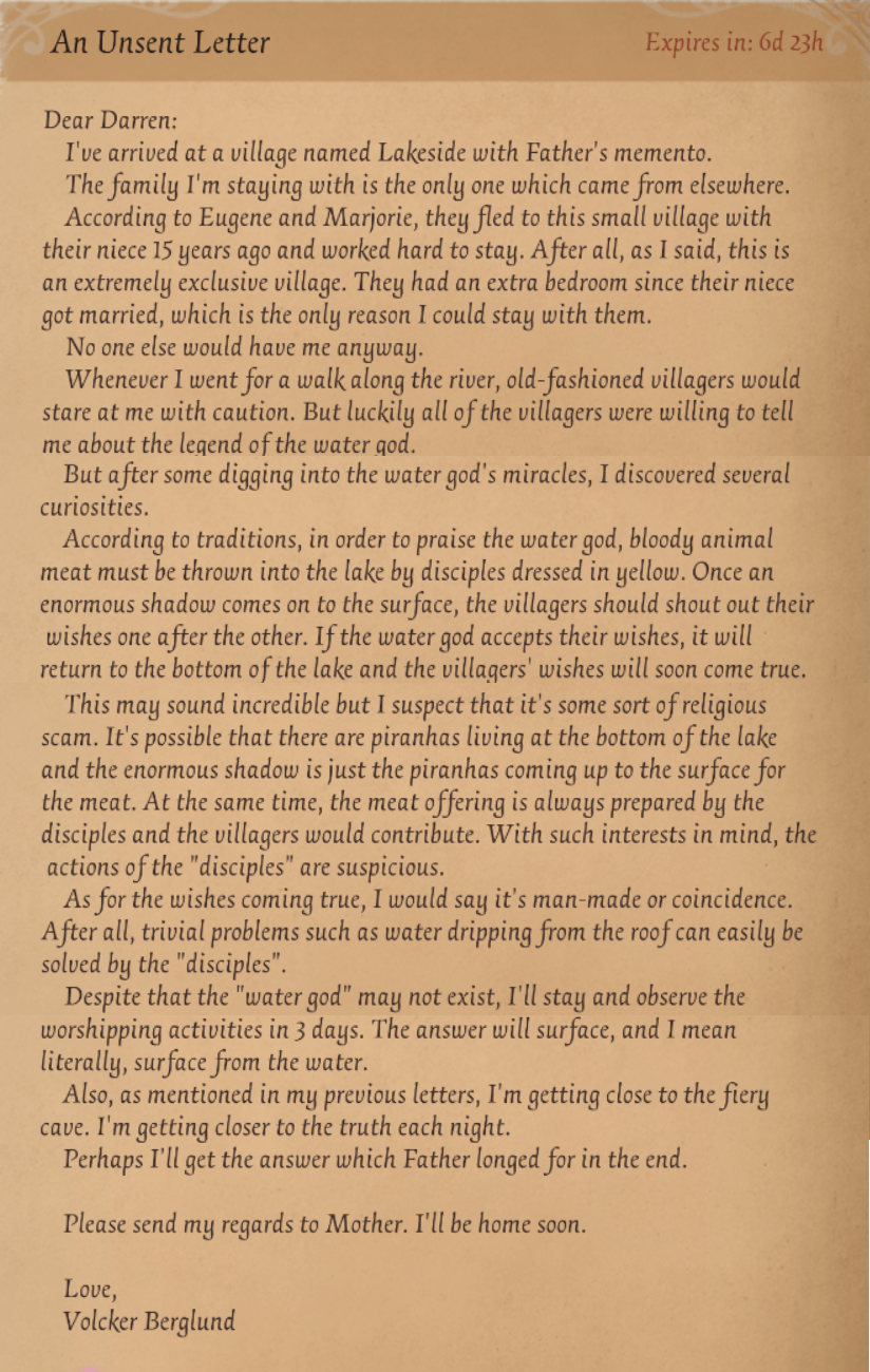 This section contains the letters the player receives after completing Hastur's Character Day Event on January 24th each year. After the event they can be accessed in the file section of the character's Notebook page.