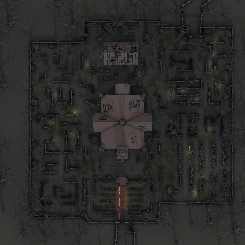 The graveyard is located to the right of the wedding area. Large headstones are located here and are placed in clusters to act as a wall. Multiple pallets are located in the graveyard. There is a trapdoor in the graveyard, but it is not a dungeon that a player can escape through.