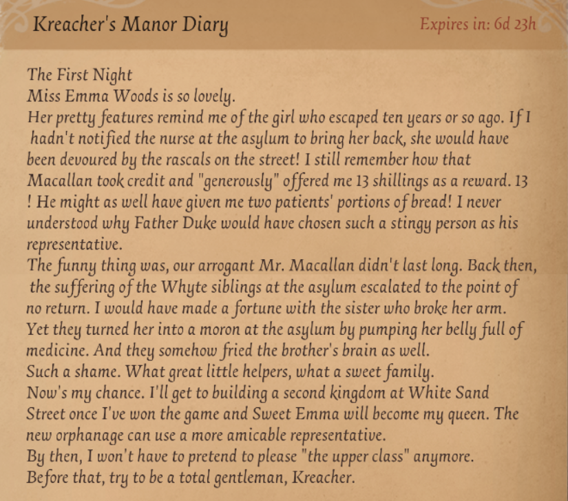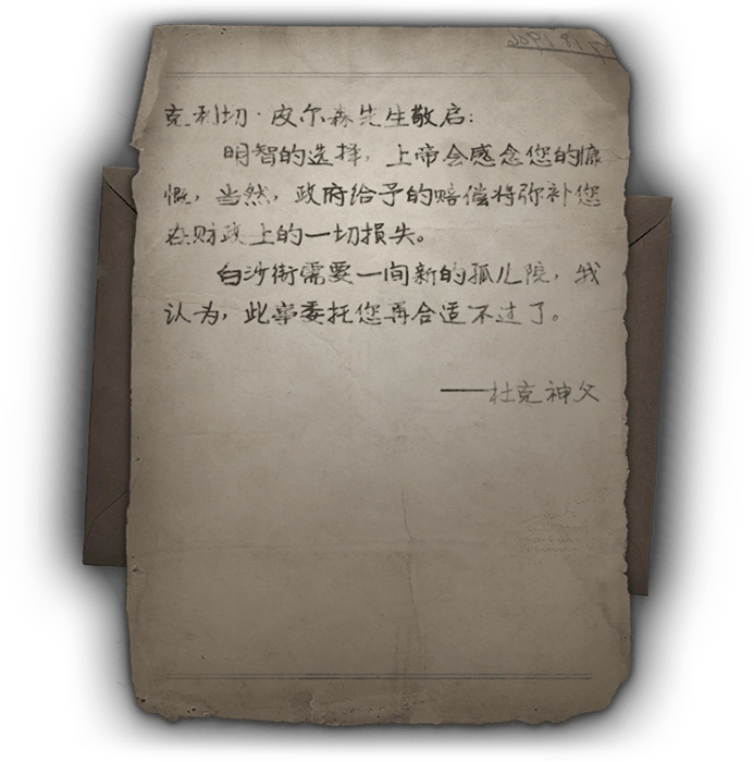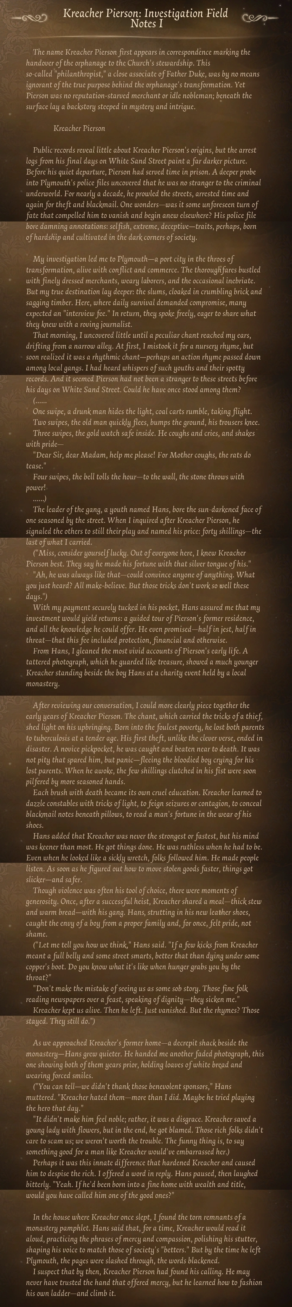 The name Kreacher Pierson first appears in correspondence marking the handover of the orphanage to the Church's stewardship. This so-called "philanthropist," a close associate of Father Duke, was by no means ignorant of the true purpose behind the orphanage's transformation. Yet Pierson was no reputation-starved merchant or idle nobleman; beneath the surface lay a backstory steeped in mystery and intrigue.