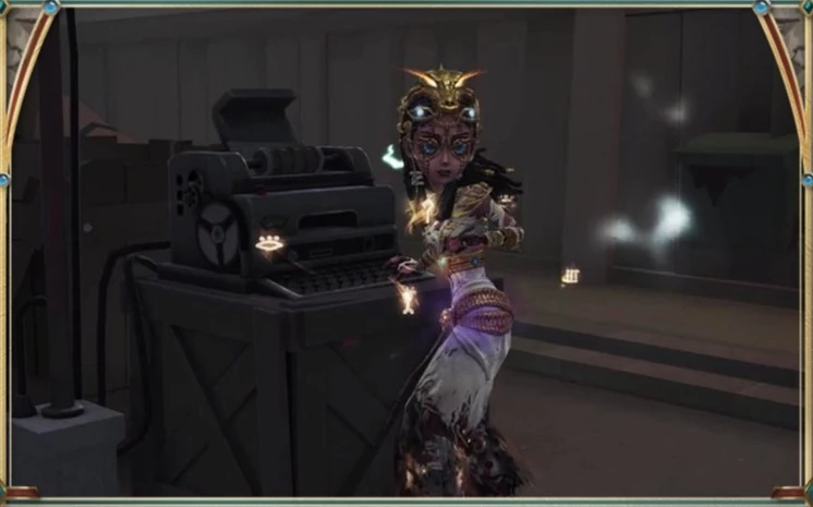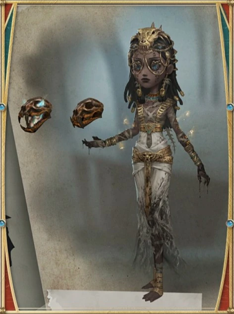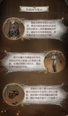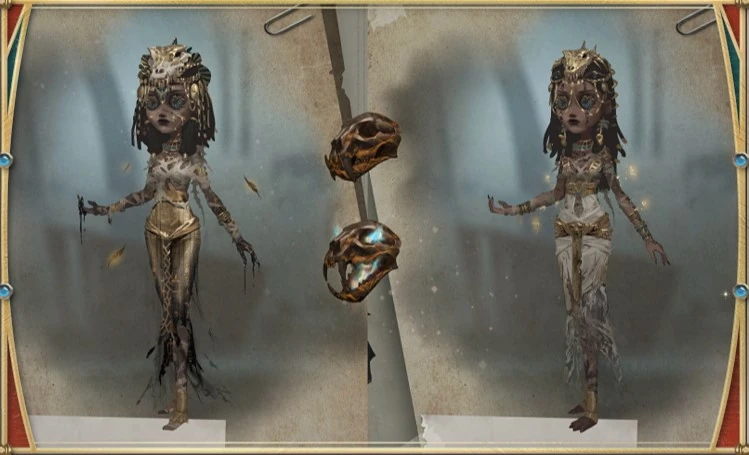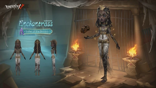 [A Costume] Enchantress - Usher of the Sinners: The skeleton of a crocodile lies on her head, a golden chain hangs down her cheek, mysterious spells are engraved on her dark skin, and her blue eyes are sharp, revealing a beautiful yet dangerous aura. Her body is wrapped in rotten cloth, and golden symbols escape from the cracks on her body. The hem of her long skirt has weathered, revealing her naked and strange feet. The dark skull glows with bronze, and the lion's sharp teeth do not lose their sharpness due to death. The sticky darkness still flows in her palms, ready to hunt the next guilty person at any time.