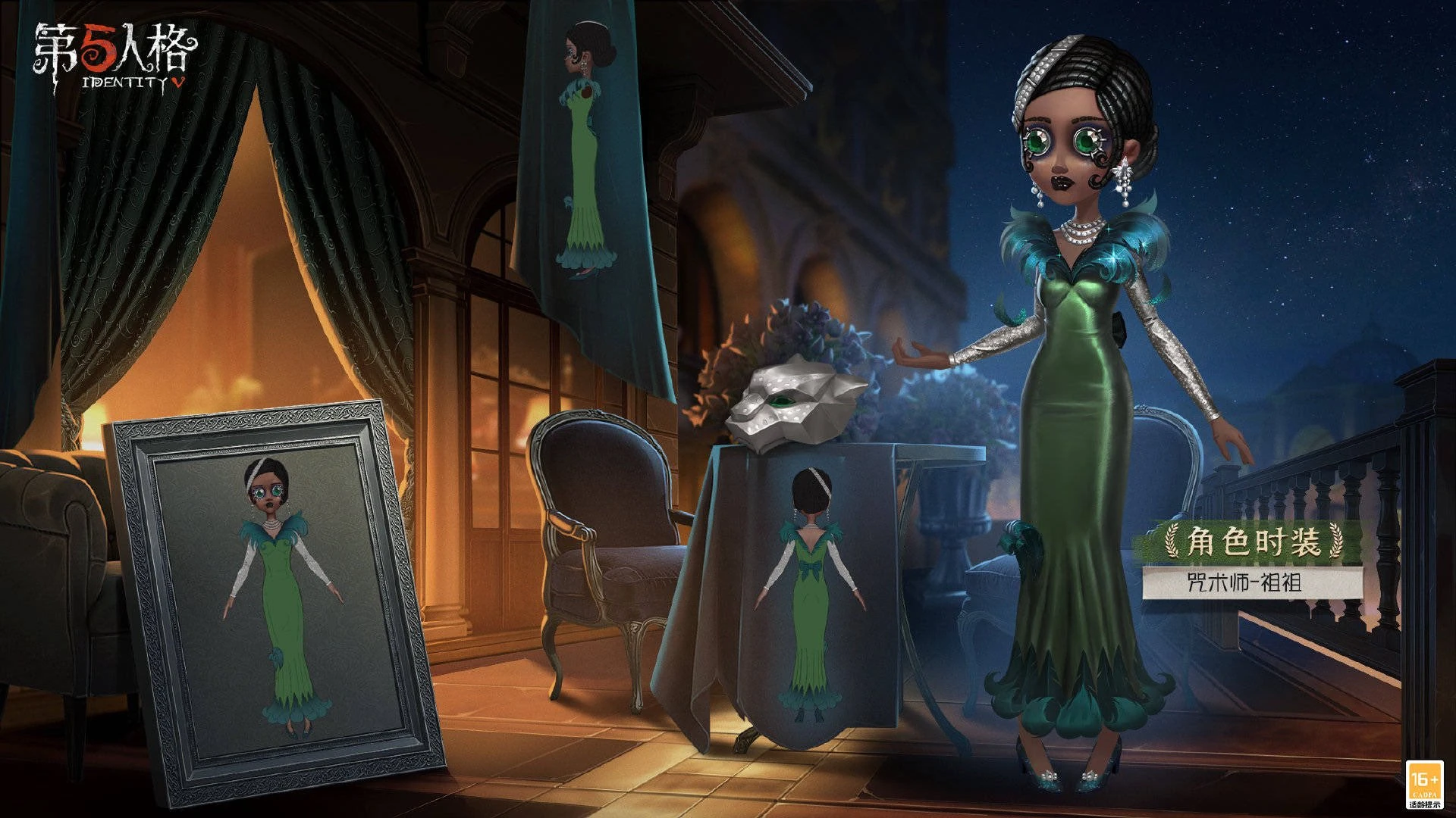 The Enchantress - Zouzou regarded the upcoming chase as a grand performance and carefully prepared the costume - the neckline and skirt of the green tight-fitting dress were decorated with large feathers, creating a grand and gorgeous atmosphere. The feathers sparkle with fluorescence, attracting everyone's attention; her sleeves are covered with silver sequins, and her necklace, headdress and pendant are also extremely bright, which contrasts sharply with her skin tone and deep black lipstick, creating a striking visual effect; the sapphire eyes shine with a charming color, conveys her perseverance and determination; the leopard head sculpture on the side is also made of silver, with blue eyes and rivet-shaped face patterns that echo the Enchantress - Zouzou.